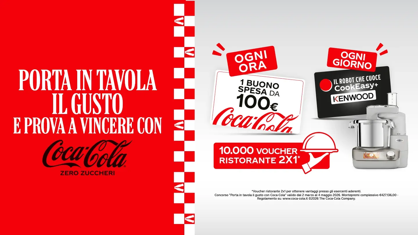 Il concorso Coca-Cola 2026 mette in palio 11.600 premi complessivi assegnati con meccanica Instant Win. Tra i premi più interessanti troviamo 10.000 voucher ristorante 2x1, 1.536 buoni spesa digitali da 100 euro e 64 Kenwood Il Robot che Cuoce, con distribuzione automatica dei premi nel corso della promozione. I buoni spesa vengono assegnati in misura di uno ogni ora, mentre il premio Kenwood viene distribuito uno al giorno.